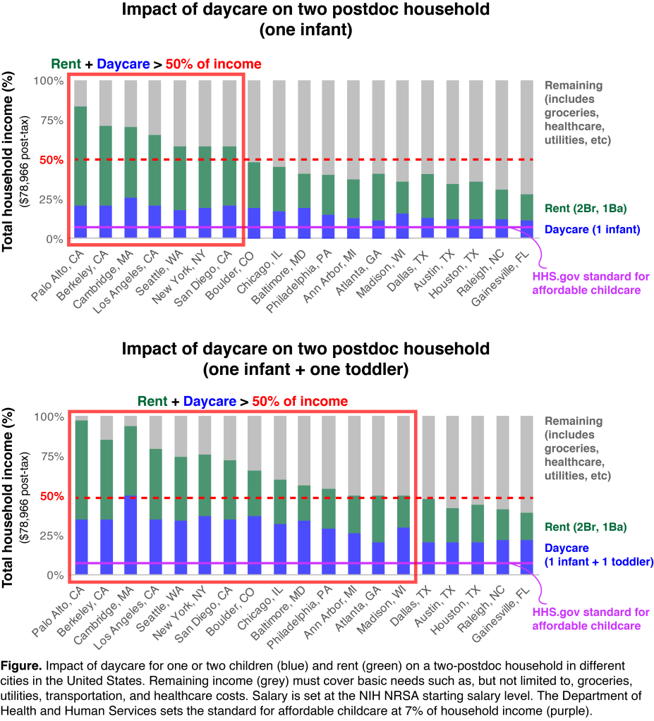 Percentage of household income assumes two-postdoc household with two NIH NRSA starting salaries of $50,004 ($78,966 after taxes, assuming a 21% effective tax rate).